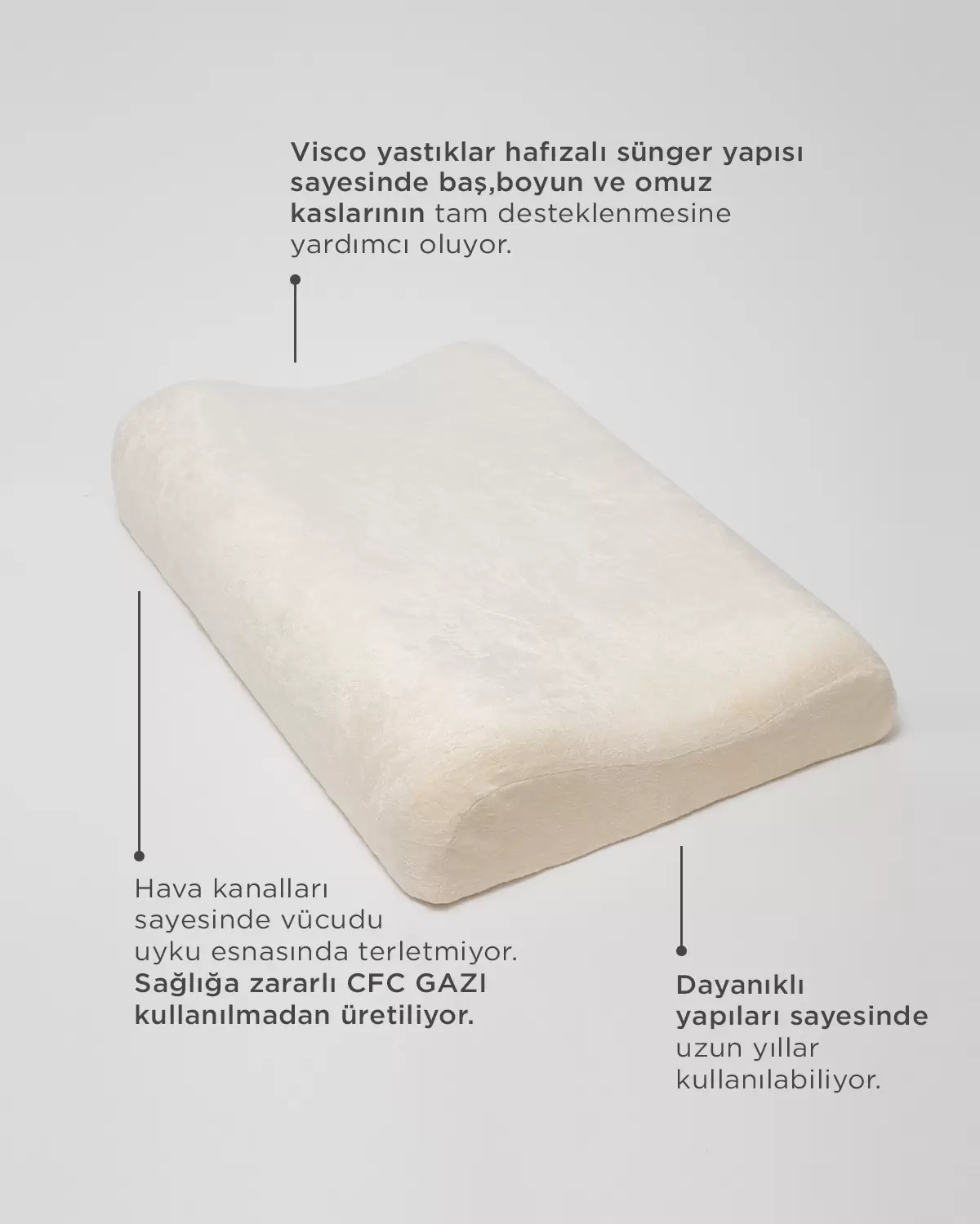 Visco yastıklar hafızalı sünger yapısı sayesinde baş,boyun ve omuz kaslarının tam desteklenmesine yardımcı oluyor. Hava kanalları sayesinde vücudu uyku esnasında terletmiyor. Sağlığa zararlı CFC GAZI kullanılmadan üretiliyor. Hipoalerjenik yapısı sayesinde üzerinde bakteri,küf,mantar yada toz akarları barındırmıyor. Dayanıklı yapıları sayesinde uzun yıllar kullanılabiliyor.